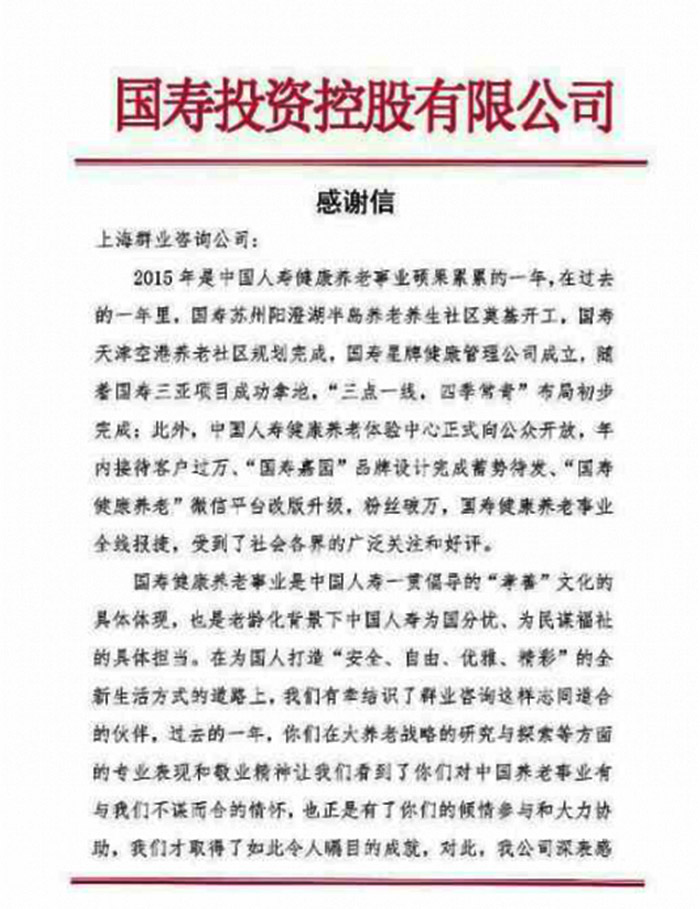 2016年2月26日,群业咨询就国寿“大养老”战略进行正式汇报,国寿投资控股王军辉总裁,杨华良副总裁,养老养生投资部陈伟波总经理及养老团队成员出席听取汇报。